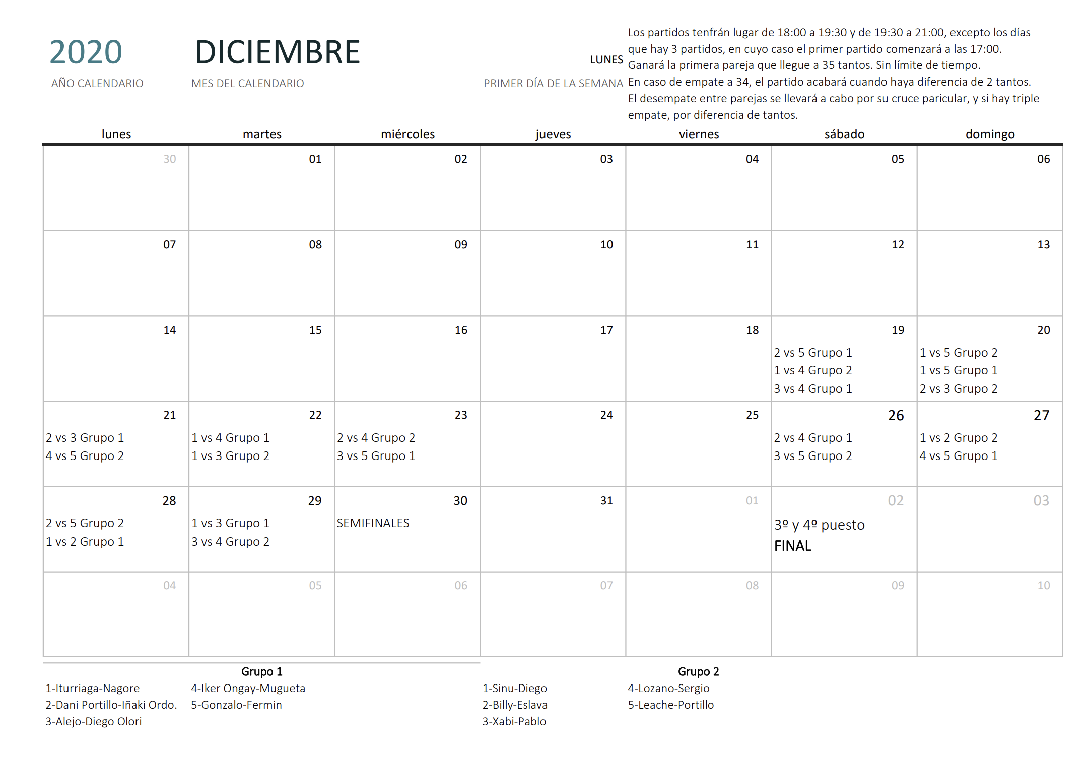 Los partidos tendrán lugar de 18:00 a 19:30 y de 19:30 a 21:00, excepto los días que hay 3 partidos, en cuyo caso el primer partido comenzará a las 17:00. Ganará la primera pareja que llegue a 35 tantos. Sin límite de tiempo.