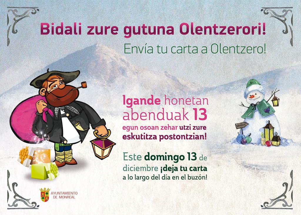 ¡Envía tu carta a Olentzero! / Bidali zure gutuna Olentzerori! izgusuario0811 diciembre, 202011 diciembre, 2020 Monreal - Noticias, Monreal - Tablon, Portada Igande honetan abenduak 13 egun osoan zehar utzi gure eskutitza postontzian! Este domingo 13 de diciembre ¡deja tu carta a lo largo del día en el buzón!