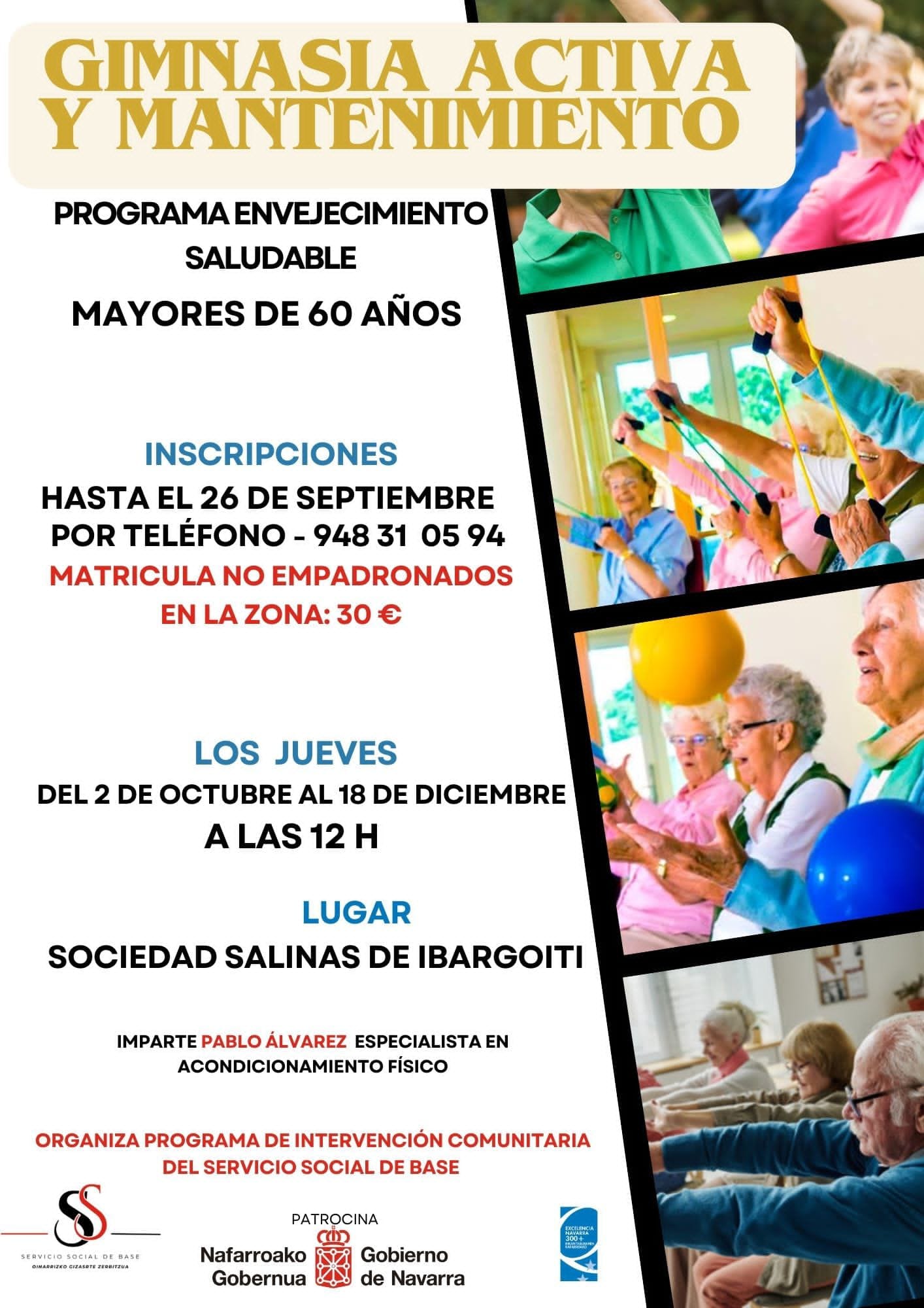 Gimnasia activa y mantenimiento izgusuario0826 septiembre, 202526 septiembre, 2025 Monreal - Noticias, Portada Programa envejecimiento saludable mayores de 60 años. Inscripciones hasta el 26 de septiembre. 948310594 Jueves del 2 de octubre al 18 de diciembre. Sociedad Salinas de Ibargoiti. Toda la información en cartel adjunto.
