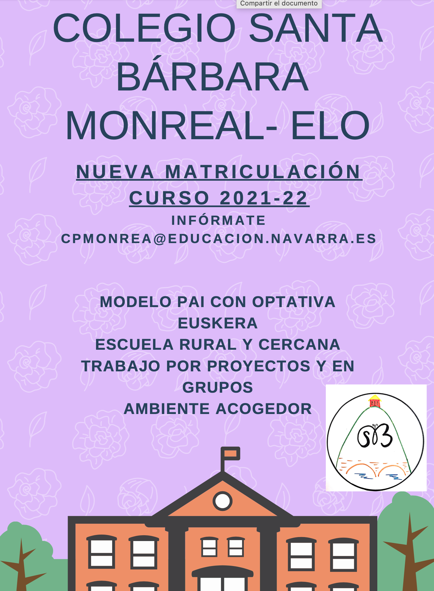 Matriculación CP Santa Bárbara 2021 – 2022 izgusuario082 febrero, 20212 febrero, 2021 Monreal - Noticias, Portada NUEVA MATRICULACIÓN COLEGIO SANTA BÁRBARA DE MONREAL- ELO CURSO 2021-22 INFÓRMATE: CPMONREA@EDUCACION.NAVARRA.ES MODELO: PAI CON OPTATIVA EUSKERA ESCUELA RURAL Y CERCANA TRABAJO POR PROYECTOS Y EN GRUPOS AMBIENTE ACOGEDOR