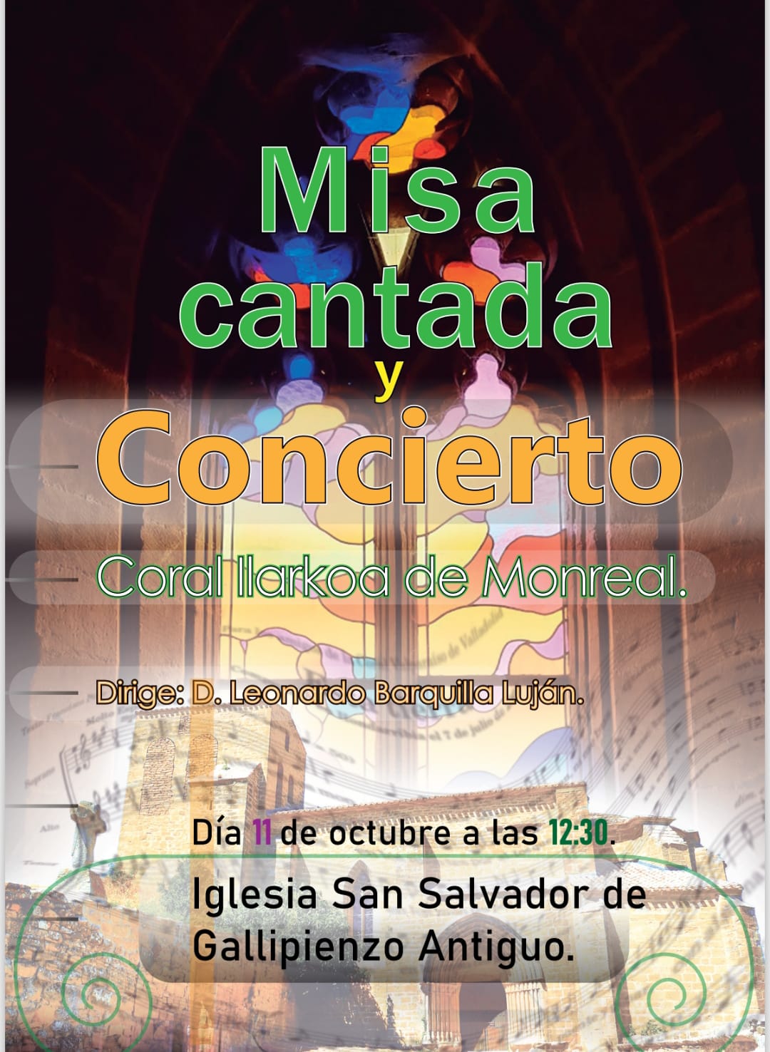 MISA CANTADA Y CONCIERTO izgusuario0810 octubre, 2025 Monreal - Noticias, Portada Coral Ilarkoa de Monreal Dirige: D. Leonardo Barqulla Luján – 11/10/25 – 12:30 – Iglesia San Salvador – Gallipienzo Antiguo