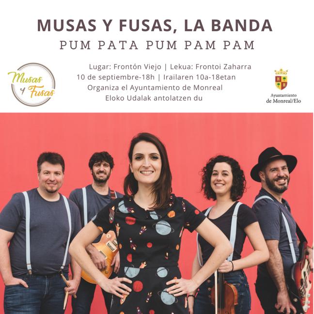MUSAS Y FUSAS, LA BANDA izgusuario087 septiembre, 20217 septiembre, 2021 Monreal - Noticias, Portada PUM PATA PUM PAM PAM Septiembre 10 Iraila Hora/hordua: 18:00 Frontón viejo/Frontoi zaharrean