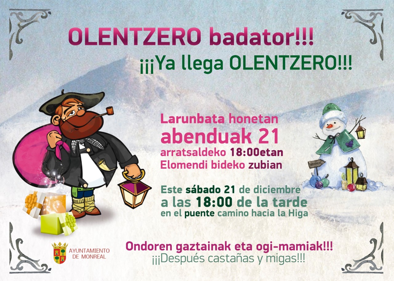 Olentzero badator!!!/¡¡¡Ya llega el Olentzero!!! izgusuario0816 diciembre, 2019 Monreal - Noticias, Monreal - Tablon, Portada Este sábado 21 de diciembre a las 18:00 de la tarde en el puente camino hacia la Higa. ¡¡¡Después castañas y migas!!!