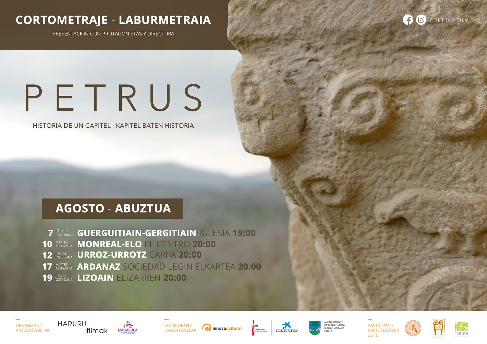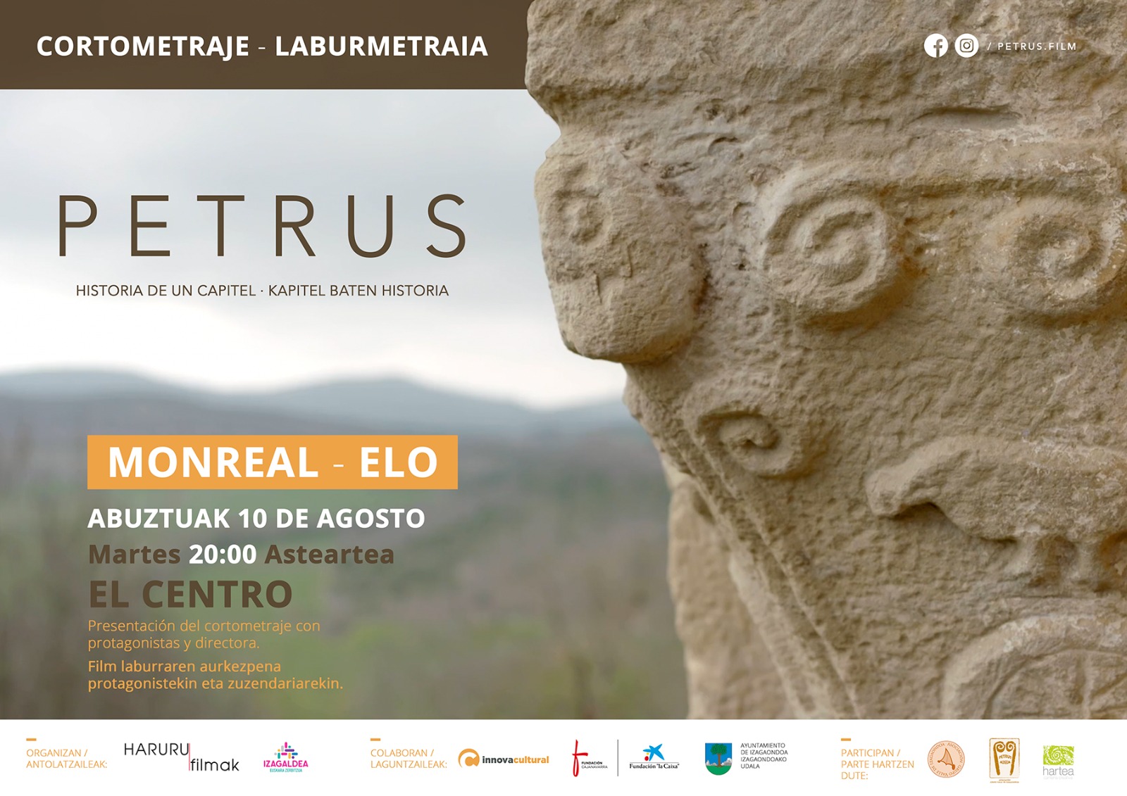 PETRUS: Cortometraje – Laburmetraia (Historia de un capitel – Kapitel baten historia) izgusuario0831 julio, 202131 julio, 2021 Monreal - Noticias, Portada Monreal – Elo Abuztuak 10 de Agosto Martes 20:00 Asteartea EL CENTRO Presentación del cortometraje con protagonistas y directora. Film laboraren aurkezpena protagonisterkin eta zuzendariarekin.