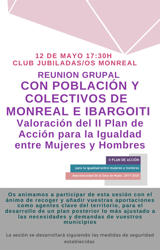 El día 12 de mayo a las 17.30 en el club de jubilados/as de Monreal, se va a celebrar una reunión grupal participativa con población y colectivos de Monreal e Ibargoiti para valorar el II PLAN DE ACCIÓN PARA LA IGUALDAD ENTRE MUJERES Y HOMBRES.